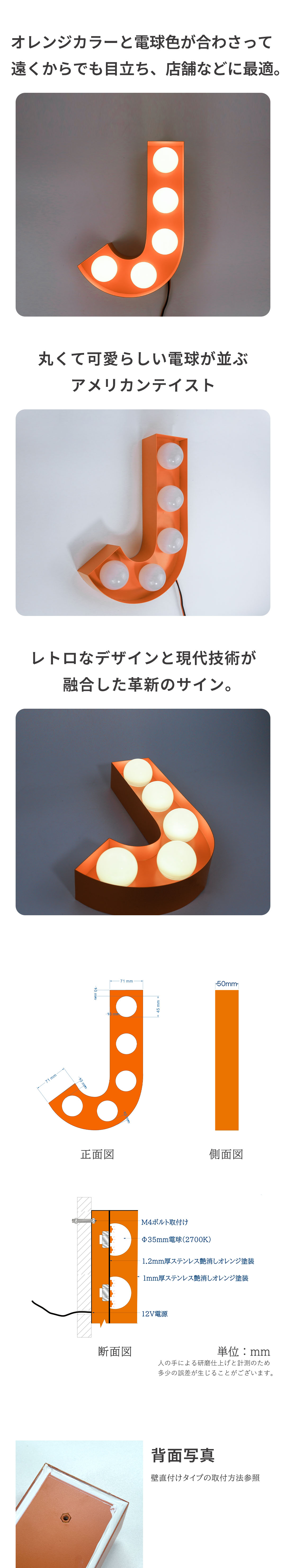 文字を型とりした枠内に電球を等間隔に並べることで可愛さもあり、更に電球が明るく発光するので人々の視線を惹きつける視認性が高いサインです。